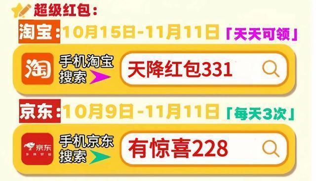 主推红包口令:【天降红包331】【红红火火2255】【动动手指10000】,最高 25888 元专属红包口令:【开心就好5522】【冬天美美338】【天降红包251】,可领品类券领取时间:10 月 15 日 - 11 月 14 日领取方式:打开淘宝 APP 搜索对应口令即可。淘宝双十一主推红包口令:【天降红包331】【红红火火2255】【动动手指10000】建议在晚8点前10分钟搜索,此时红包池刚更新,大额概率更高,领完记得在“我的红包”里勾选“自动抵扣”,避免结算时忘记使用。